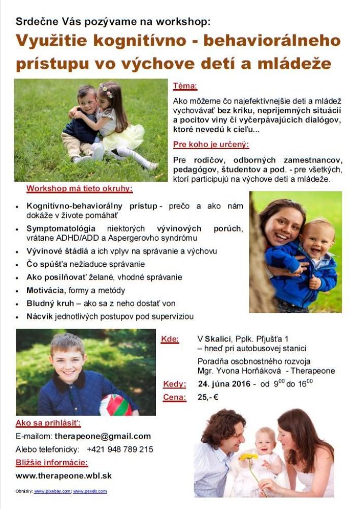 V dôsledku zvýšeného záujmu o problematiku výchovy s pomocou kognitívno-behaviorálneho prístupu ako zo strany rodičov, tak i zo strany odborníkov, vznikol nový workshop, určený všetkým, ktorí participujú na výchove deti a mládeže - či už s rôznymi vývinovými poruchami, no i bez nich. Preto reflektujeme uvedenú potrebu a zaraďujeme teraz - pred prázdninami alternatívu, ako môžeme čo najefektívnejšie deti a mládež vychovávať tak, aby z nich vyrástli úspešní a sebavedomí ľudia. Bez kriku, bez nepríjemných situácií a pocitov viny či vyčerpávajúcich dialógov, ktoré nakoniec nevedú k cieľu...