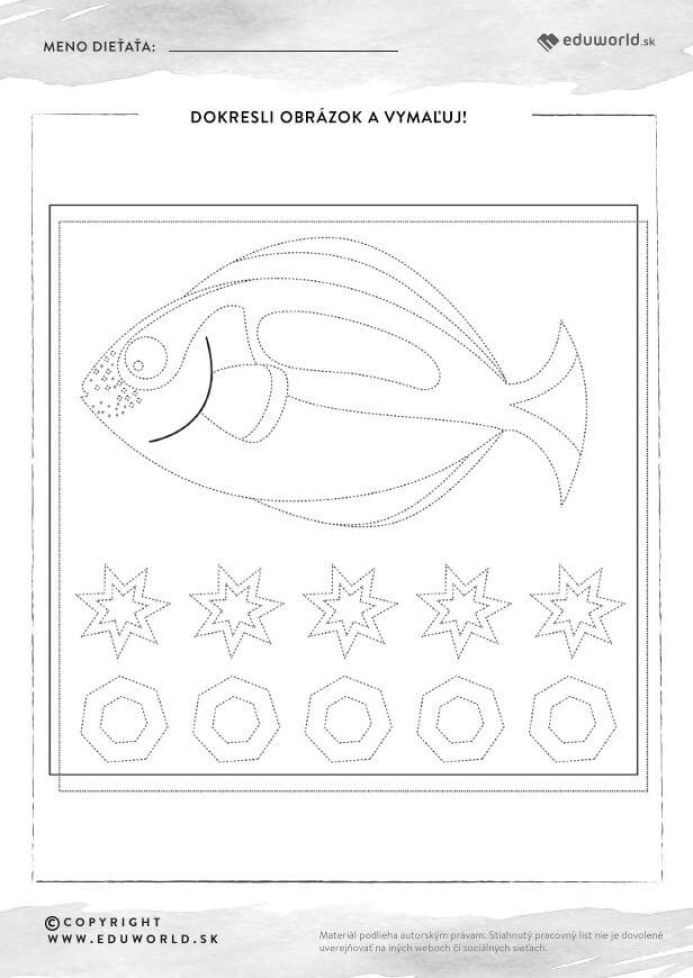 Dokresľovanie obrázkov / Všetky oblasti Obkresli obrázok s rybičkou a vymaľuj Redakcia Autor materiálu © Copyright info materiál pre: Materské školy rozsah: 1 strana Obkresli si obrázky a nakoniec vymaľuj.