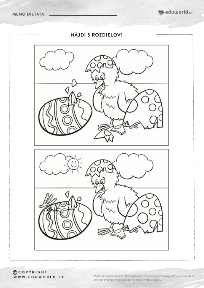 Hľadanie rozdielov / Všetky oblasti Nájdi 5 rozdielov! Redakcia Autor materiálu © Copyright info materiál pre: Materské školy rozsah: 1 strana Poriadne si pozri oba obrázky a nájdi 5 rozdielov.